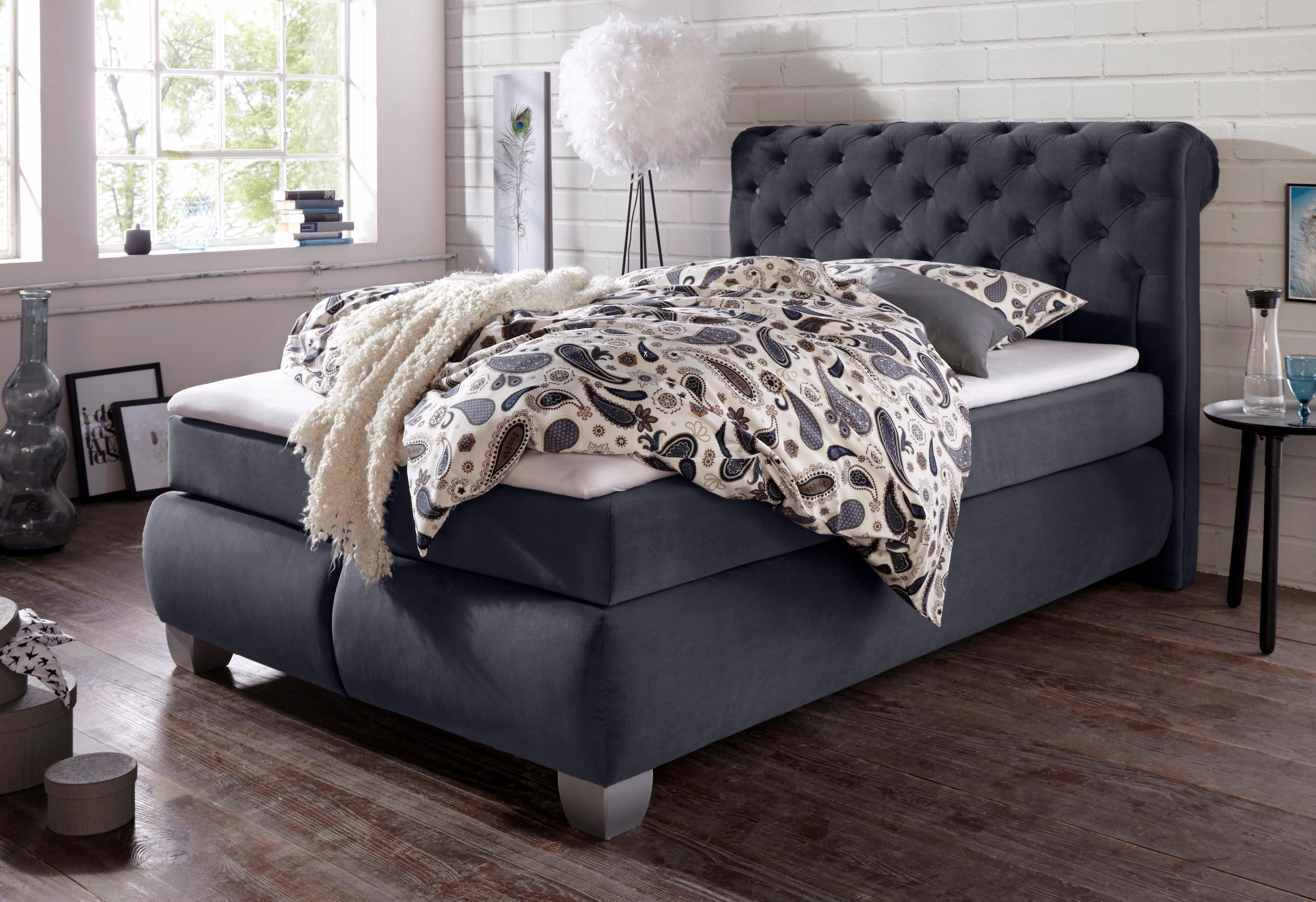 Romantisches Boxspringbett. Chesterfield Knopfheftung im Kopfteil. Wahlweise mit Kunstleder oder Samt bezogen. Komfortabel gepolstert. Komfortliegehöhe 58 cm
