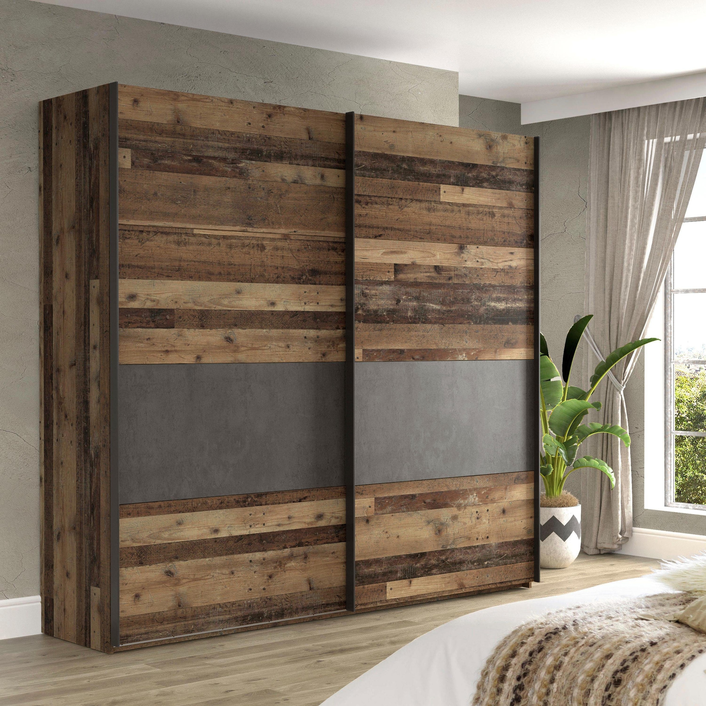 Schwebetürenschrank in angesagter Optik. Pflegeleichteunststoffoberfläche. Kleiderstangen und Beschläge aus Metall.
