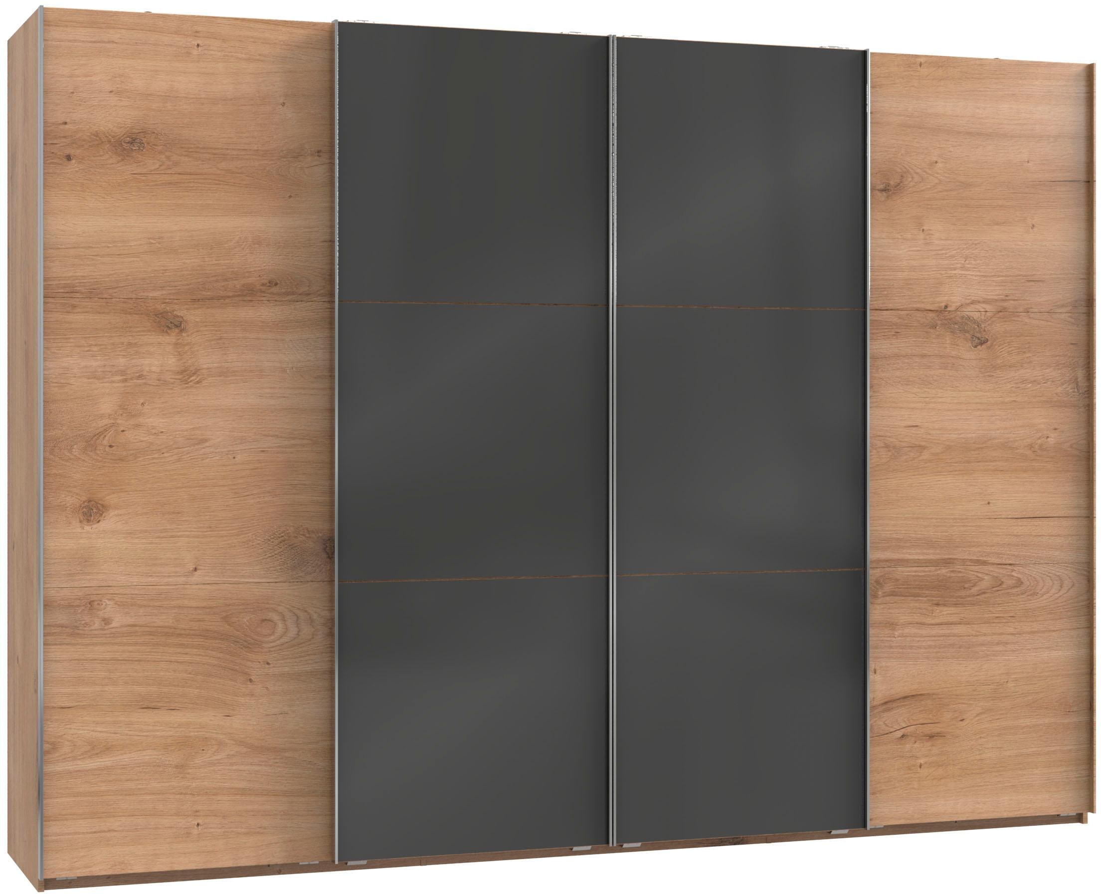 Moderner Schrank mit platzsparenden Schwebetüren. Mit Synchronöffnung der Mitteltüren, Panoramaöffnung. Mit 2 Glastüren. Sockelhöhenverstellung zum Ausgleich von Fußbodenunebenheiten. Tiefe/Höhe: 65/216 bzw. 236 cm