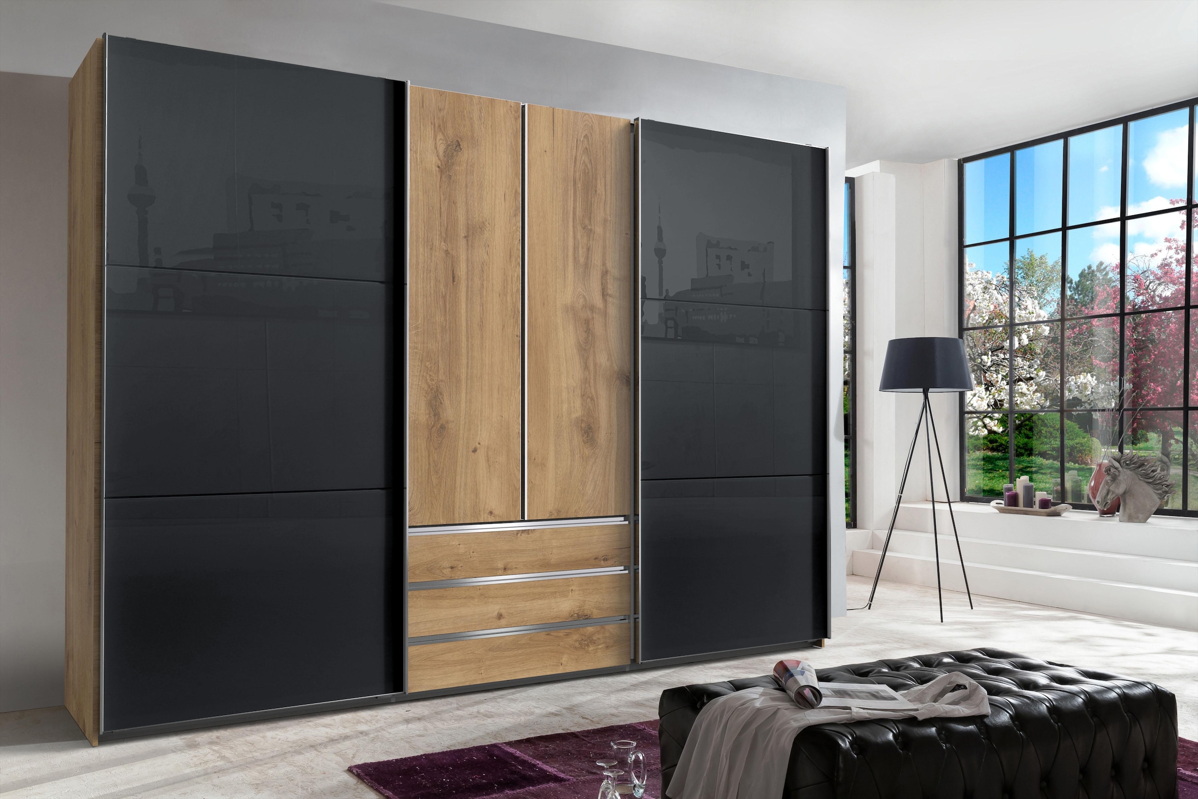 Schwebetüren außen mit Glas-Elementen. Mittig mit 2 Drehtüren. Mit geräumigen Schubkästen. Sockelhöhenverstellung zum Ausgleich von Fußbodenunebenheiten. Tiefe/Höhe: 65/216 cm bzw. 236 cm