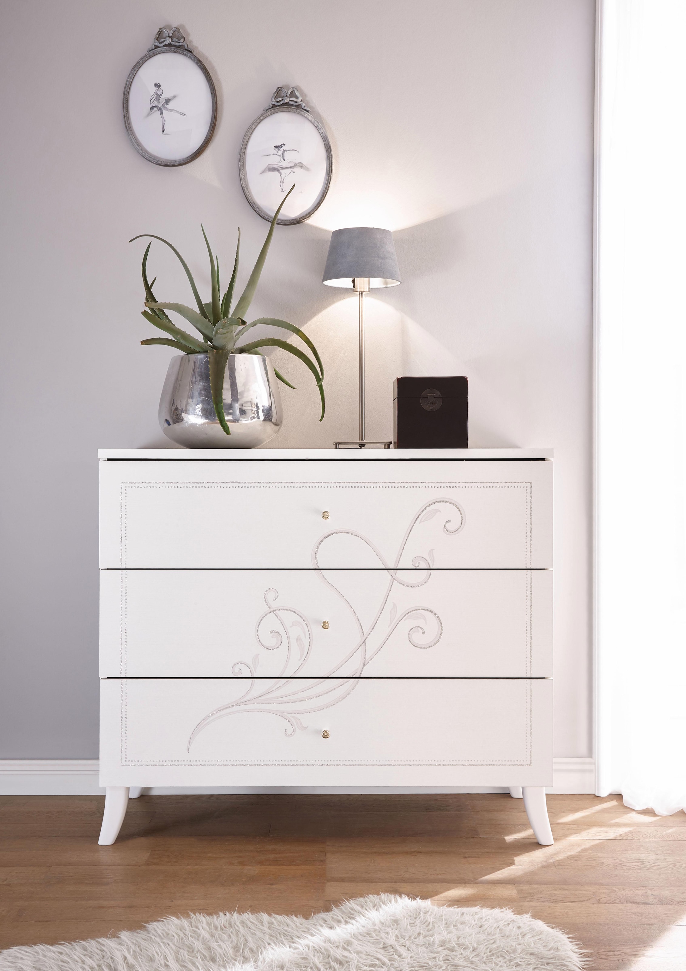 Kommode. Mit 3 Schubkästen. Fronten mit glitzerndem Siebdruck. Metallgriffe in Blumen-Optik. B/T/H: 104/46/92 cm