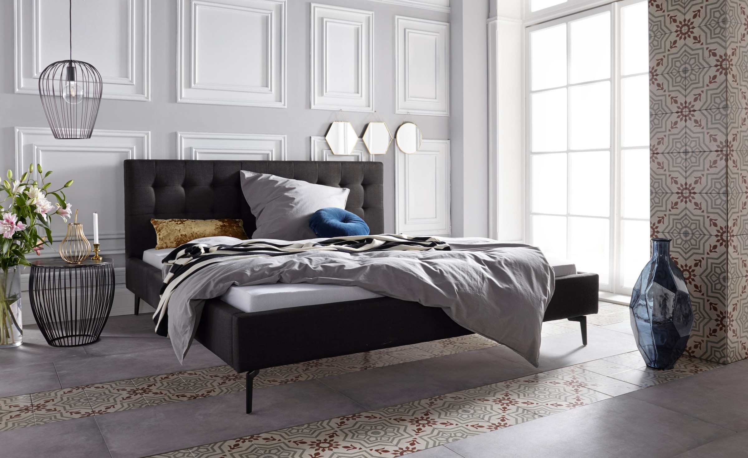 Leonique – Luxuriöses, zeitgenössisches Wohnen. Schönes Polsterkopfteil mit edler Knopfheftung. Mit eleganten Metallfüßen. Aus massivem Kiefernholz. Pflegeleichter feiner Strukturbezug