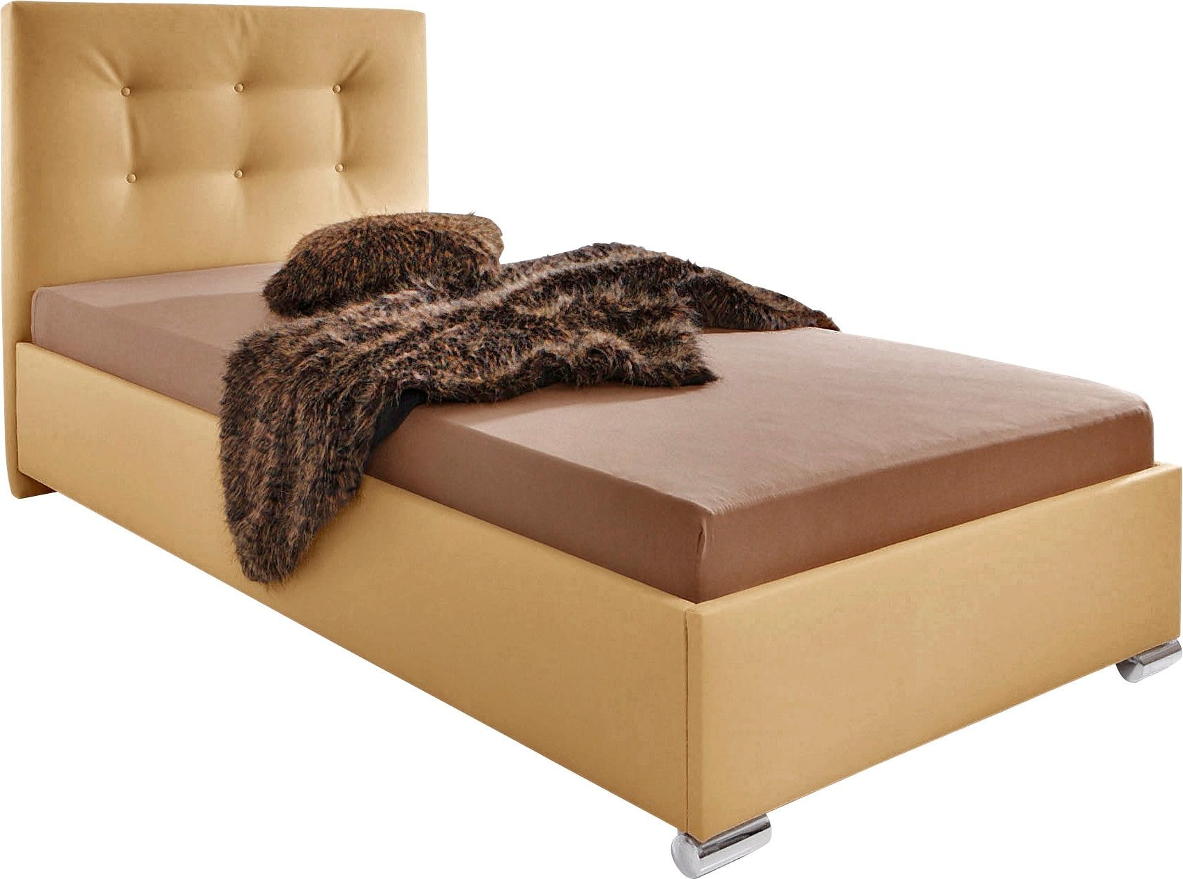 Kopfteil mit dekorativer Knopfheftung. Als Bettgestell oder inkl. Matratze. Pflegeleichtes Kunstleder. Einlasstiefe verstellbar. Made in Germany