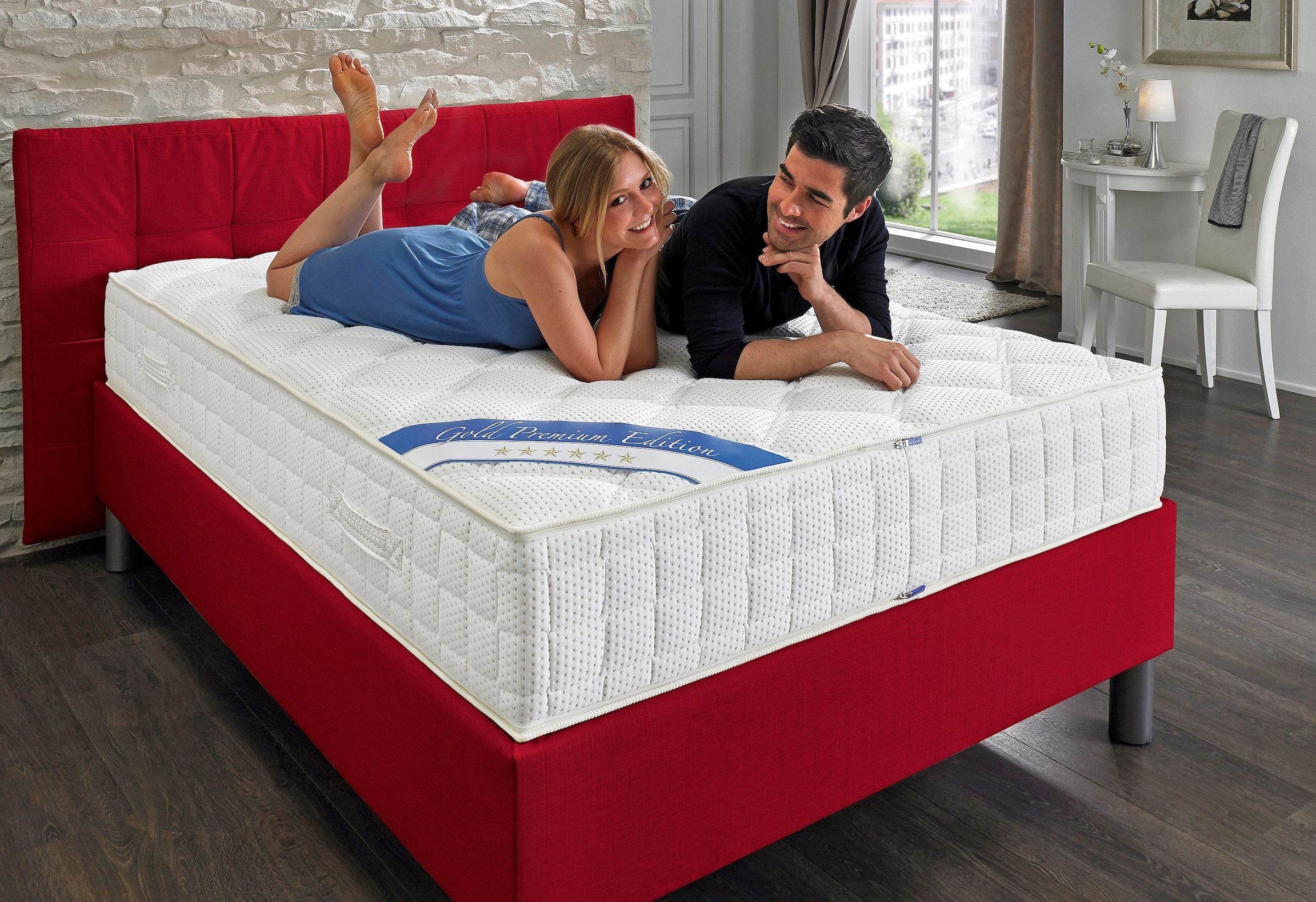 Die Matratze mit Boxspring-Feeling! Die klassischen Boxspring-Betten erreichen ihren hohen Komfort durch ein System, bei dem bereits der Rahmen mit einem eigenen Federungssystem ausgestattet ist. Die neue Matratzen-Serie »Gold« von MALIE zeigt die technische Weiterentwicklung dieser Idee: Eine Tonnen-Taschenfederkern-Matratze, die beidseitig mit einer 6 cm hohen Komfortschaumabdeckung und zusätzlich mit 3 cm dickem Soft-Stepp-Schaum ergänzt wird. Durch diesen Sandwich-Aufbau und eine ergonomische 7-Zonen-Einteilung wird eine extrem hohe Punktelastizität und gleichzeitig eine äußerst gute Druckentlastung erreicht. Die Schultern werden wirkungsvoll entlastet und das Becken sanft gestützt. Der luftdurchlässige Aufbau gewährleistet einen schnellen Feuchtigkeitsabtransport und verhindert Wärmestaus. Der hochwertige Doppeltuch- Bezug ist mit atmungsaktiver Klimafaser versteppt. Mit 4 Schlaufen und Rundumreißverschluss zur einfachen Handhabung und für hygienischen Komfort, abnehmbar und 3-teilig waschbar (Oberseite, Unterseite, Mittelstück). Die luxuriöse Höhe von ca. 32 cm bietet beim Aufstehen und Hinsetzen einen gesteigerten Komfort. Premium-Qualität = 1000er Tonnentaschenfedern.
