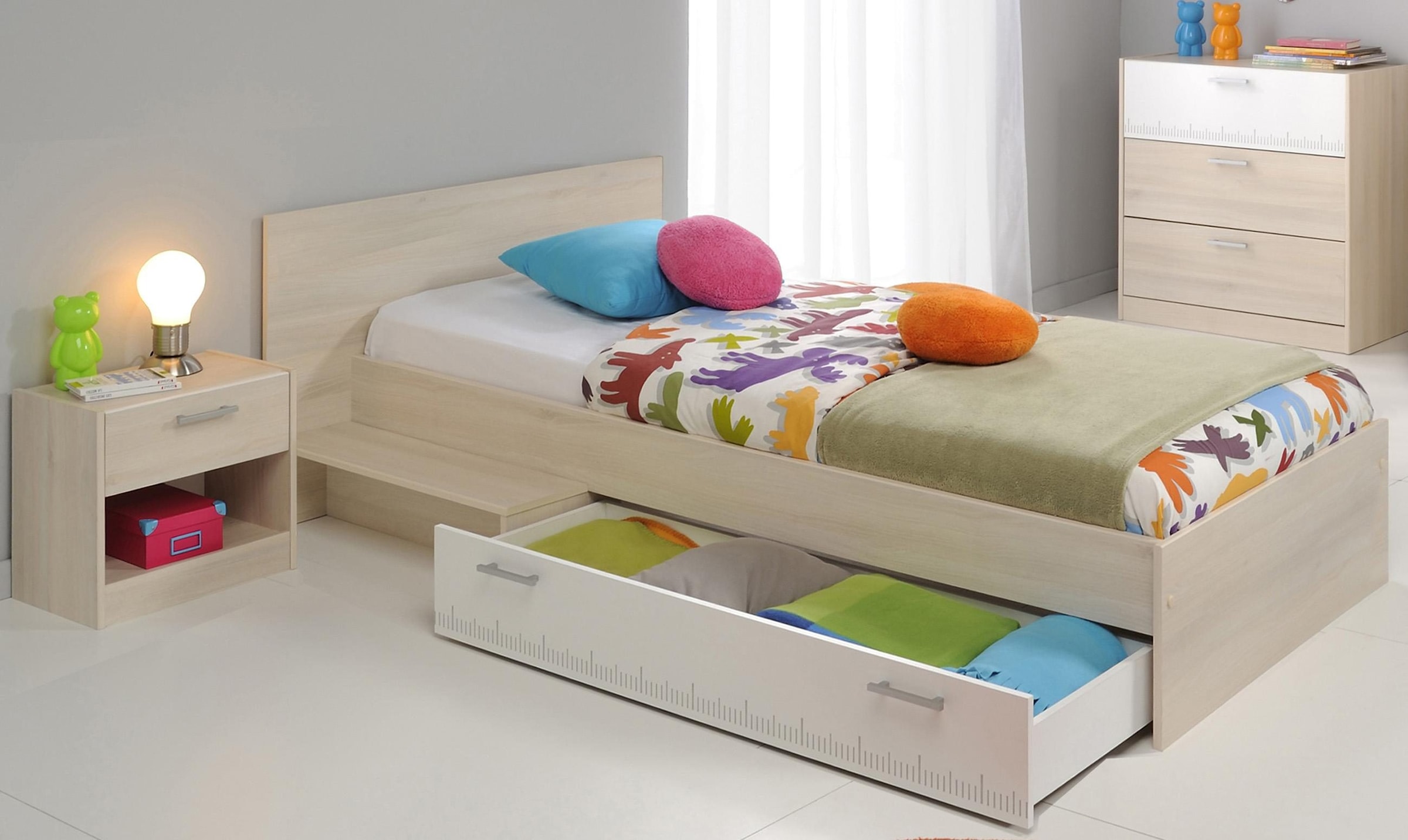 Set bestehend aus Bett, Nachttisch und Schubkastenkommode. Bett inkl. geräumigen Bettschubkasten. Nachttisch mit 1 Schubkasten. Liegefläche 90/200 cm. Dekor: akaziefarben mit Weiß