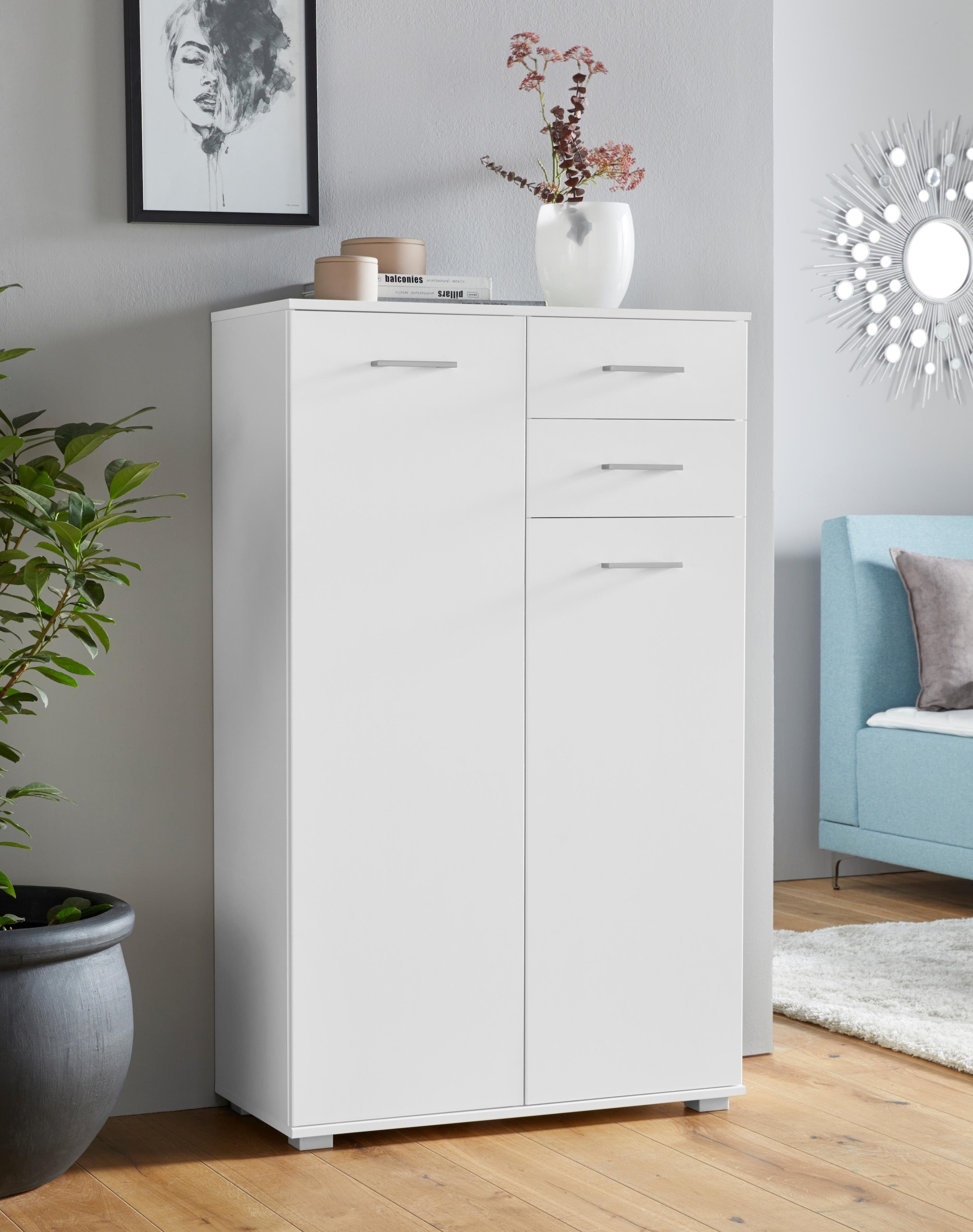 Mit 2 Schubkästen und 2 Drehtüren. Schubkästen auf Metalllaufleisten. Mit 5 verstellbaren Böden. Maße (B/T/H): 82/38/135 cm. Made in Germany