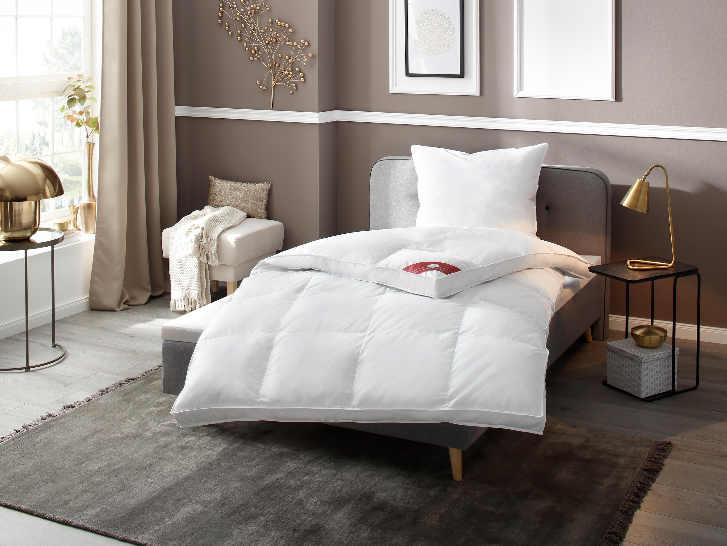 Kuschelige, extra pralle Bettdecke mit 10 cm Außenstegen inklusive Gratis-Kopfkissen. Erleben Sie erstklassigen Schlafkomfort in 5 Qualitäten. Diese Bettdecke ist hervorragend für diejenigen geeignet, die es richtig schön bauschig und kuschelig warm haben möchten. Die Bettdecke ist ähnlich wie das typisch traditionelle Oberbett, nur mit dem Unterschied, dass sie in Kassetten mit hohen Innenstegen und einem zierenden hohen Außensteg verarbeitet ist. Somit ist ein Verrutschen der Füllung über die komplette Lebensdauer ausgeschlossen. Die Füllung ist besonders dicht und voluminös, dadurch ist die Bettdecken besonders bauschig und spendet viel Wärme. Die atmungsaktive Baumwoll-Hülle in Kombination mit den feuchtigskeitsregulierenden Eigenschaften von Federn und Daunen sorgt für einen angenehmen und erholsamen Schlaf. Gratis dazu gibt es zu jeder Bettdecke 1 Kopfkissen (Größe 80×80 cm)! Das Kopfkissen bietet eine optimale Stützkraft durch die natürliche Spannkraft der Feder, Kopf und Nacken werden ideal abgestützt. Die Bettdecke und das Kopfkissen sind waschbar und in Kombination mit NOMITE sehr gut für Hausstauballergiker geeignet.