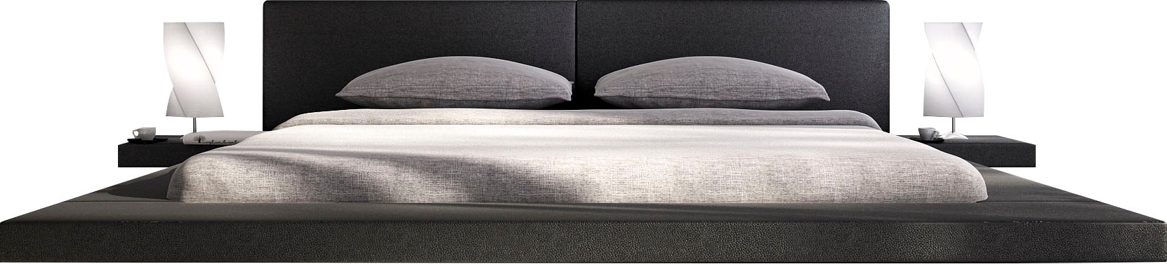 In 3 verschiedenen Größenvarianten erhältlich. Besonders niedrige Höhe verleiht dem Bett modernen Lounge-Faktor. Monochromes Design passend für viele Wohnstile. Inklusive 2 fest installierter Nachtkommoden
