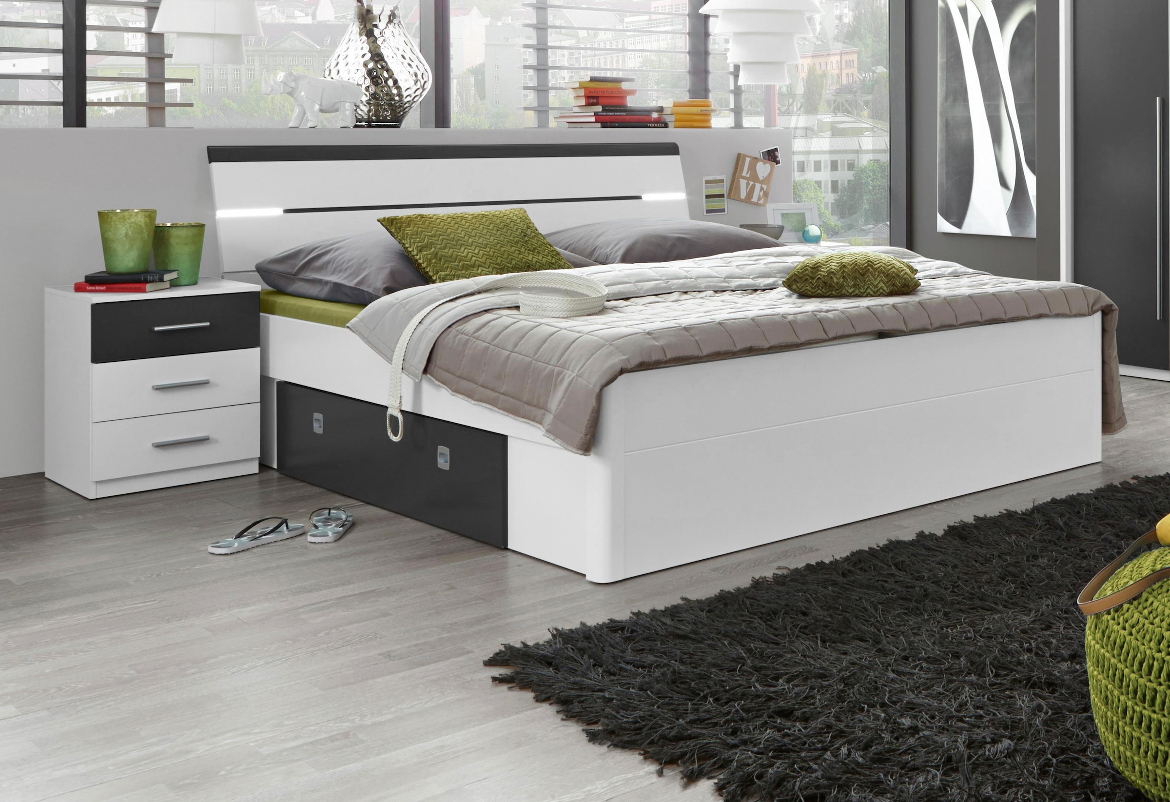Funktionales Bett mit 2 Nachttischen. Mit 2 geräumigen Schubkästen. LED-Kopfteil-Beleuchtung inklusive. Komforthöhe. Liegefläche 180/200 cm