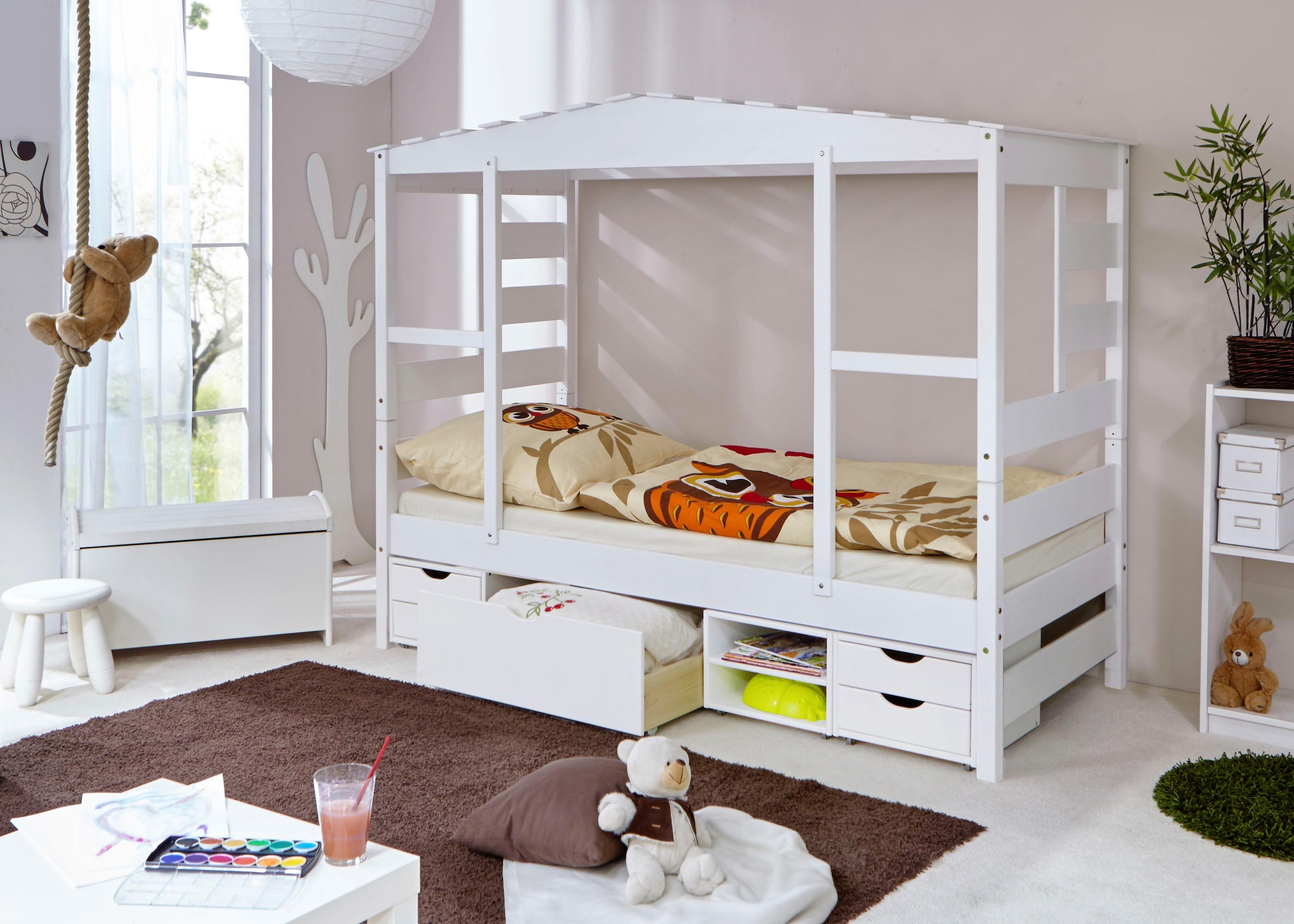 Hausbett mit Dach. Inklusive Rollrost, Matratze und Textil-Set. Kiefer massiv, FSC®-zertifiziert. Umbaufähig zum Einzelbett. Liegefläche 80×160 cm