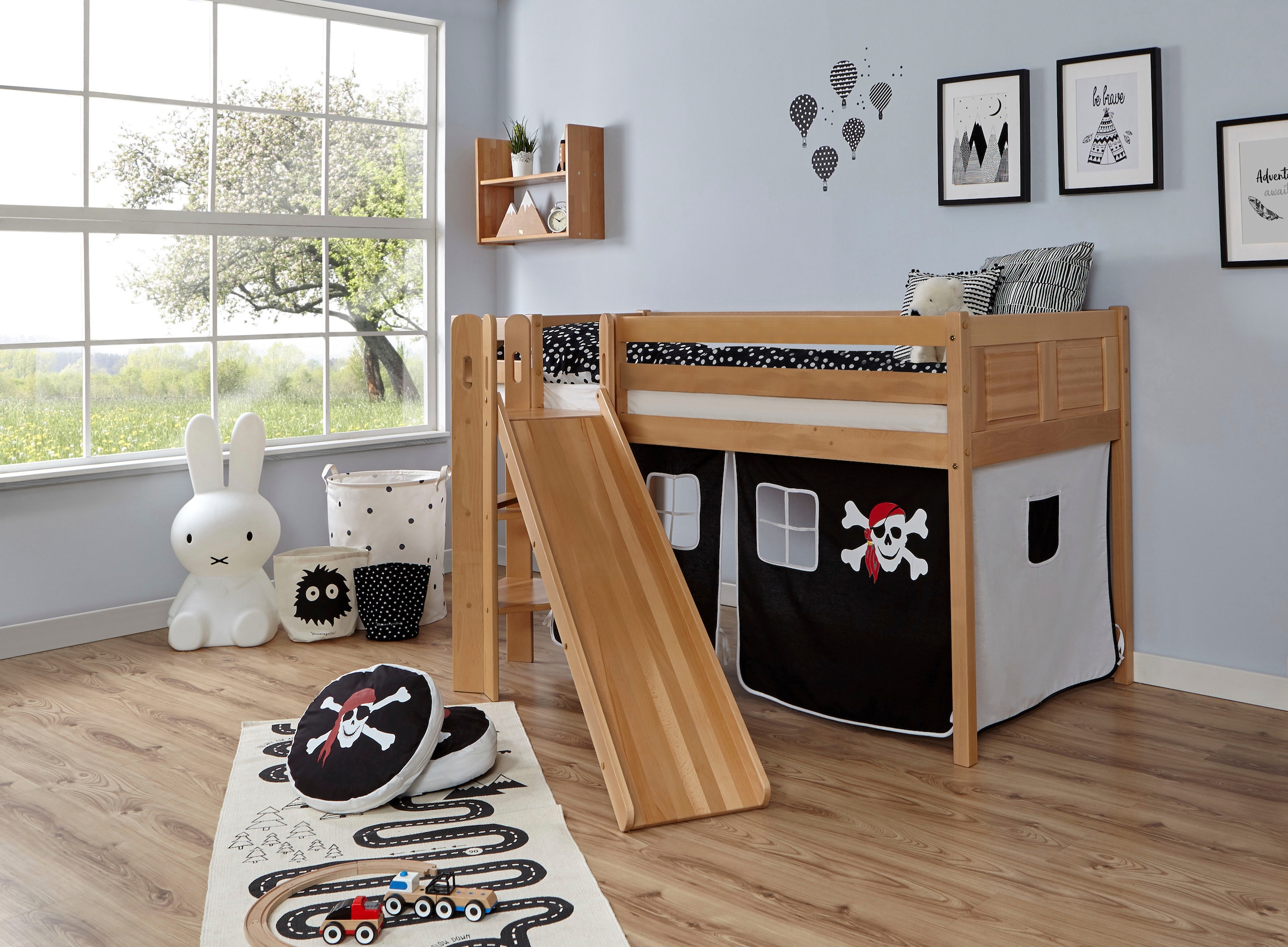 Inklusive Trittleiter und Rundum-Absturzsschutz. Inklusive Rutsche. Inklusive Textil-Set. Inklusive Rollrost. Wahlweise mit Matratze