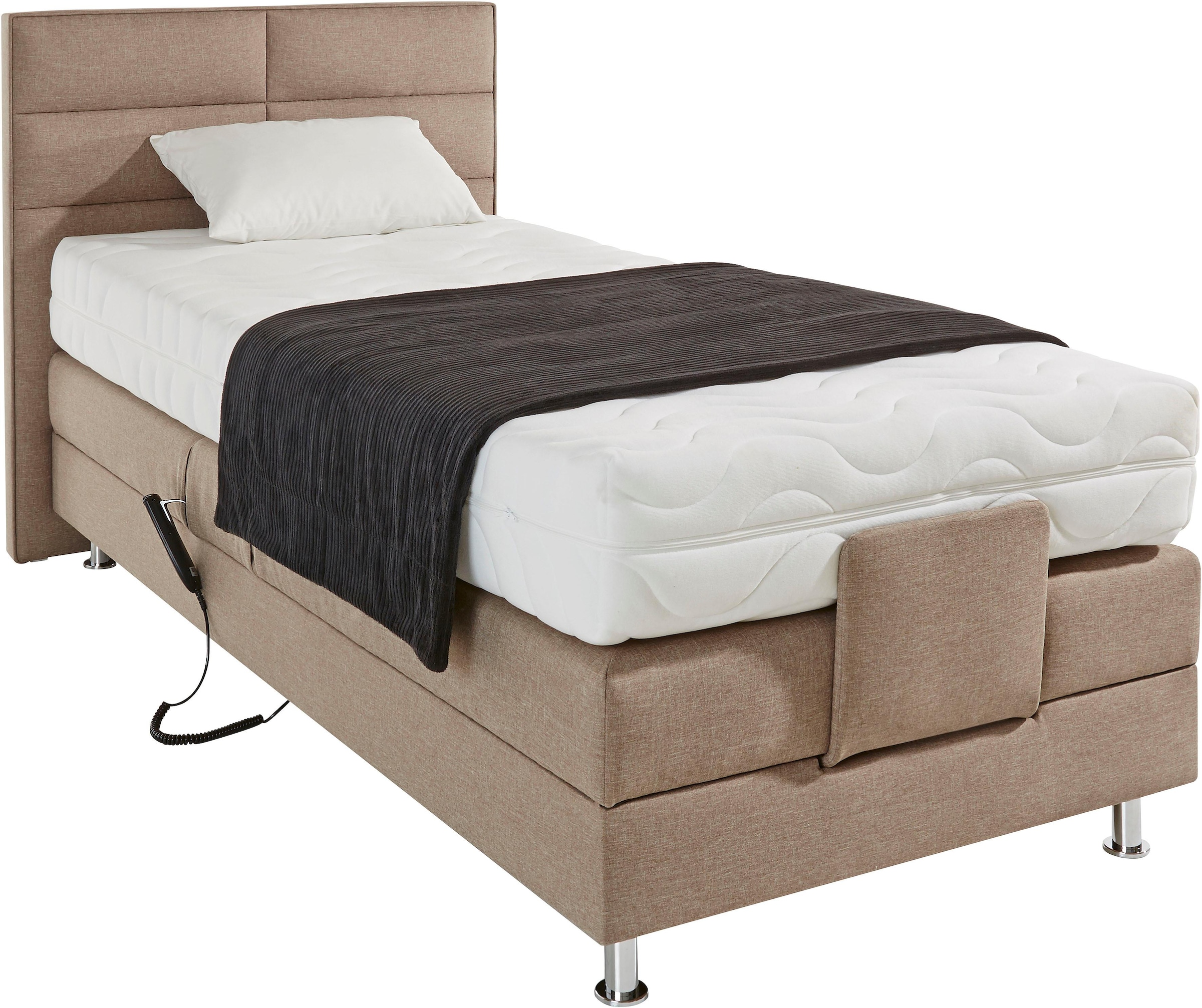 Modernes Boxbett mit Motor. Quadratische Steppung im Polsterkopfteil. Feiner Strukturstoffbezug. Haltgebende Bügel am Fußende. Komfortliegehöhe