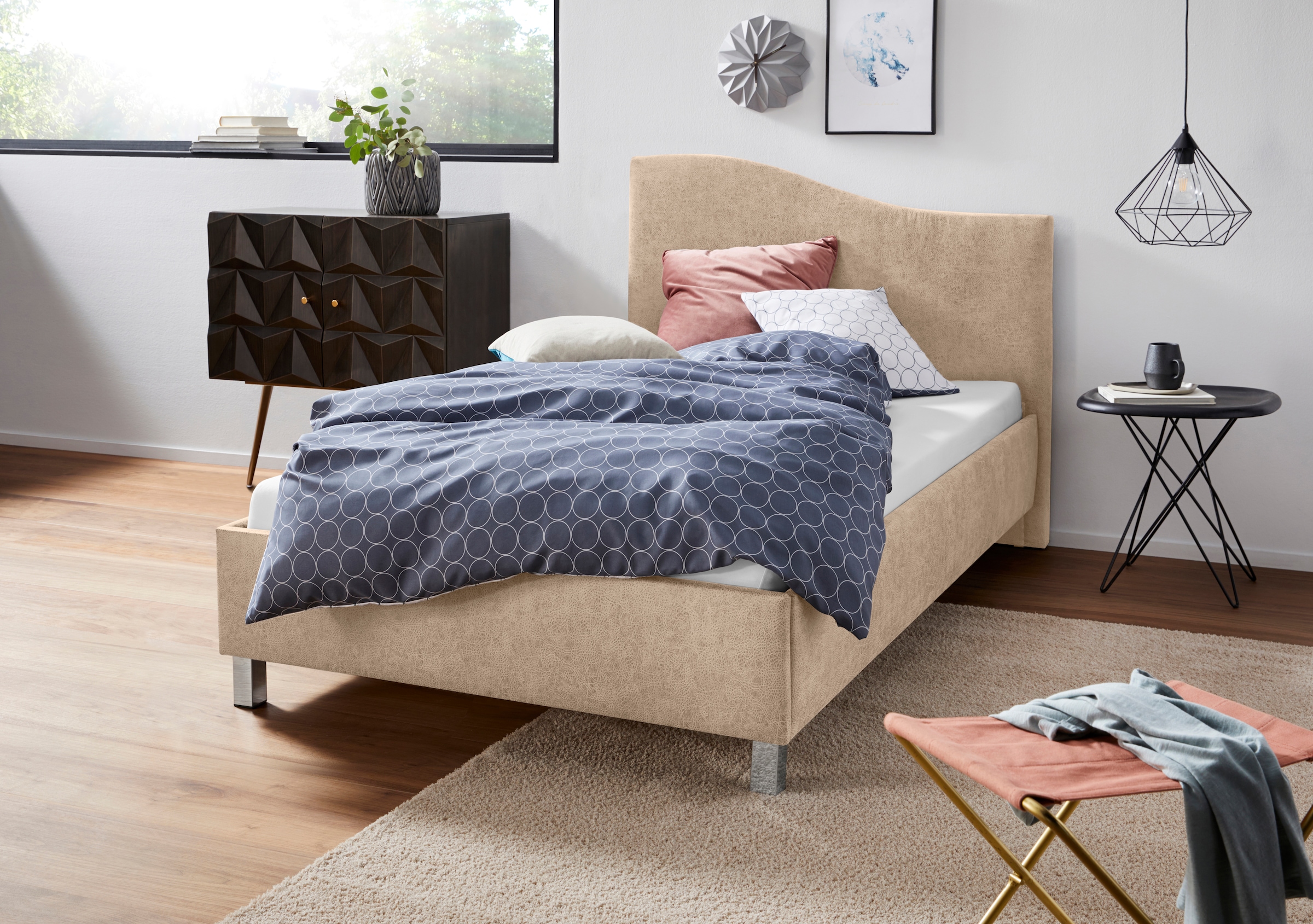 Geschwungenes Kopfteil in Lederoptik. Verchromte Metallfüße. Made in Germany