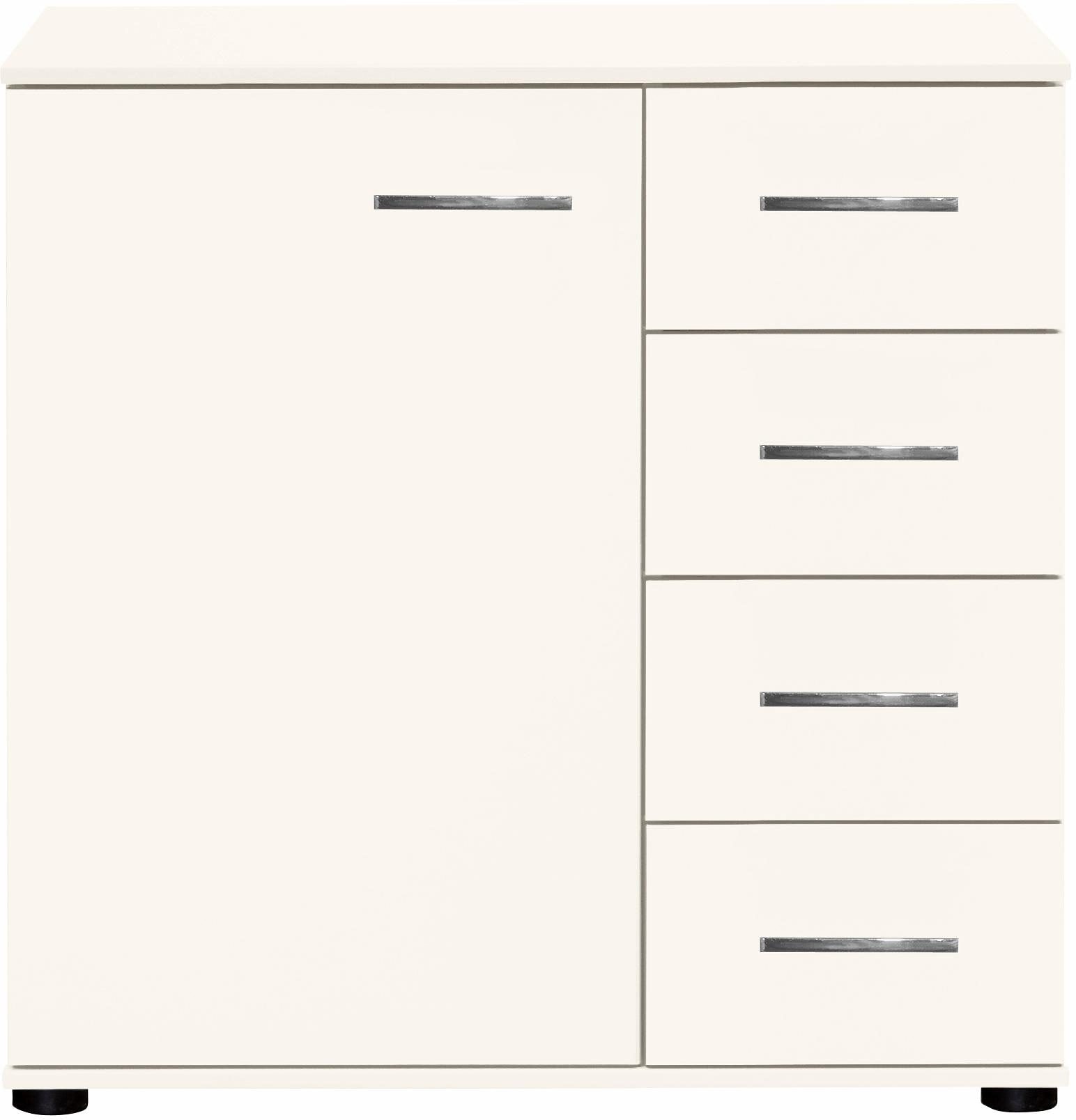 Kommode mit 4 Schubkästen und 1 Tür. Holzdekore mit besonderer Haptik. Kunststoffgriffe in Chromoptik. Schubkästen auf Metalllaufleisten. Maße (B/T/H): 81/41/83 cm