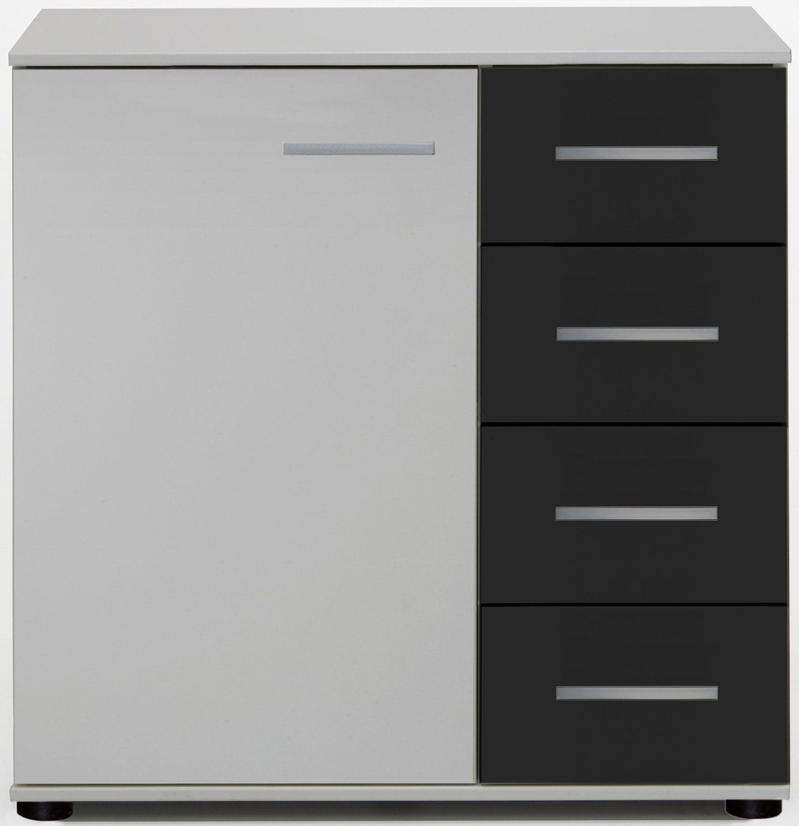 Kommode mit 1 Tür. Inkl. 4 geräumigen Schubkästen. Schubkastenfronten in Absatzfarbe. Breite/Tiefe/Höhe: 81/41/83 cm