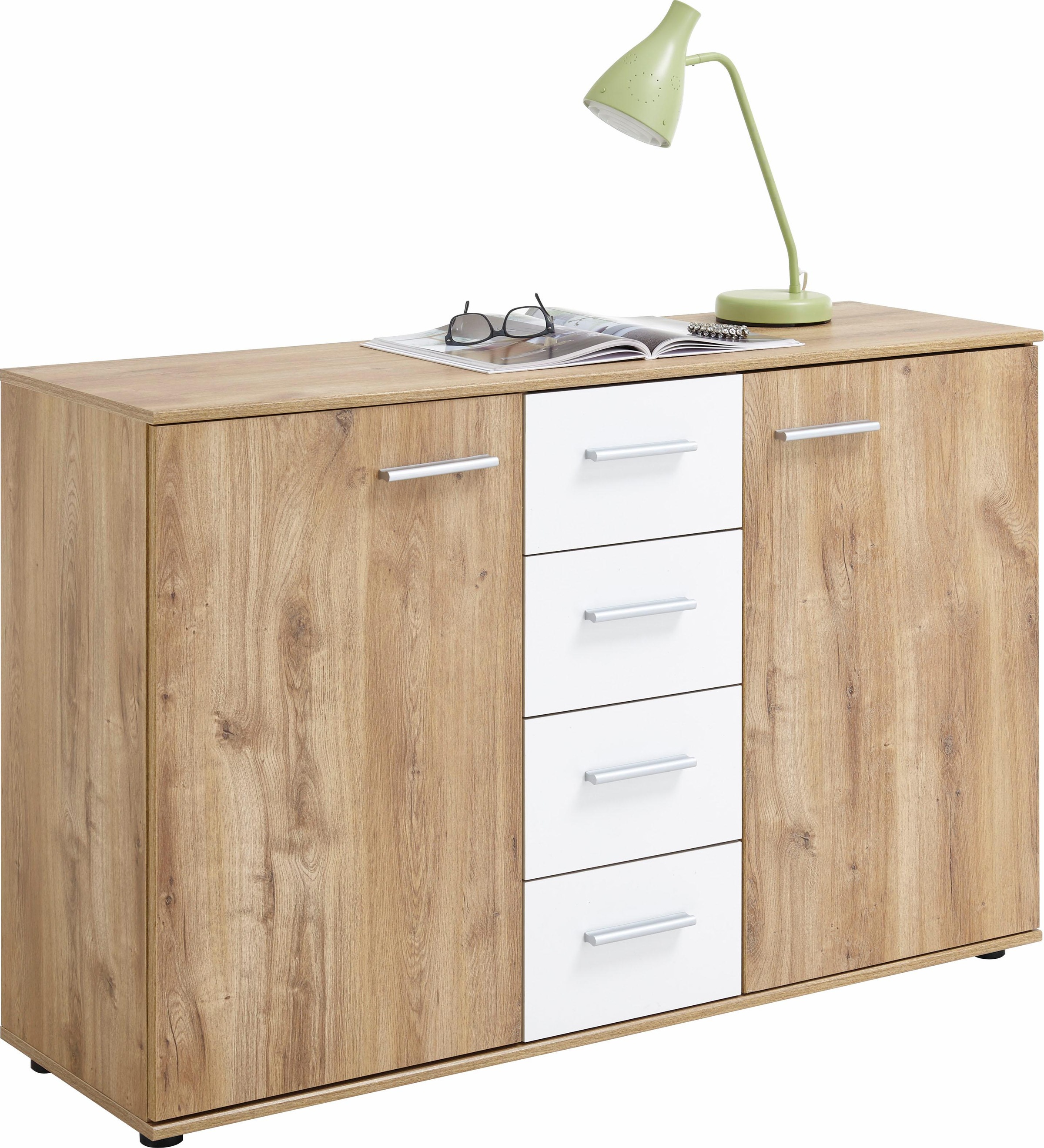 Zeitlose Kommode. Mit 2 Türen. Mittig mit 4 geräumigen Schubkästen. Alufarbene Kunststoffgriffe. B/T/H: 130/41/83 cm