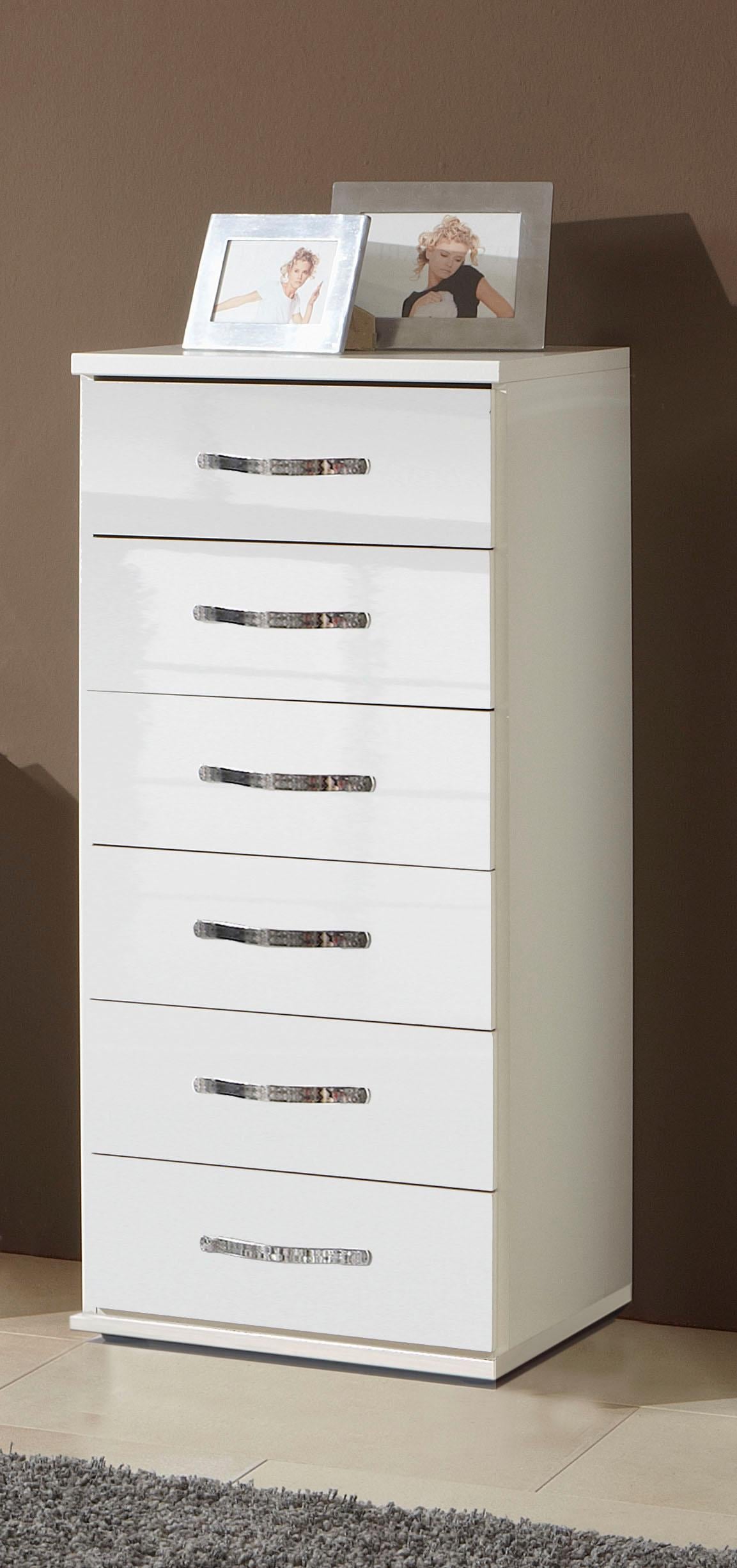 Moderne Kommode. Fronten mit Hochglanz-Dekor. Mit vielen Schubkästen. Chromfarbene Griffe